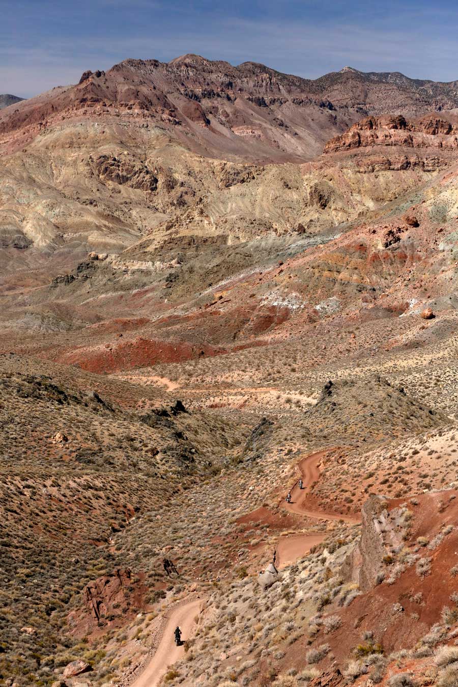 Death Valley is America’s second largest National Park. It has approximately 150 miles of paved road and over 1200 miles of dirt roads. Exploration is the name of the game today. We’ll with a run up to Dante’s View and then head to Titus Canyon which is a truly amazing off road experience. One of the dirt road treasures of Death Valley, it’s a place that few motorcyclists ever see–imagine a small Grand Canyon that’s open for riding. 30 miles in length and simply unbelievable in scenic value. Words don’t describe it adequately. If we have time toward the end of the day we’ll run north to Scotty’s Castle which is a wonderful mansion built at the turn of the 20th century by a wealthy Chicago businessman. All the materials were carted in on wagons… you’ll have to see it to believe it. It’s crazy and well worthwhile.