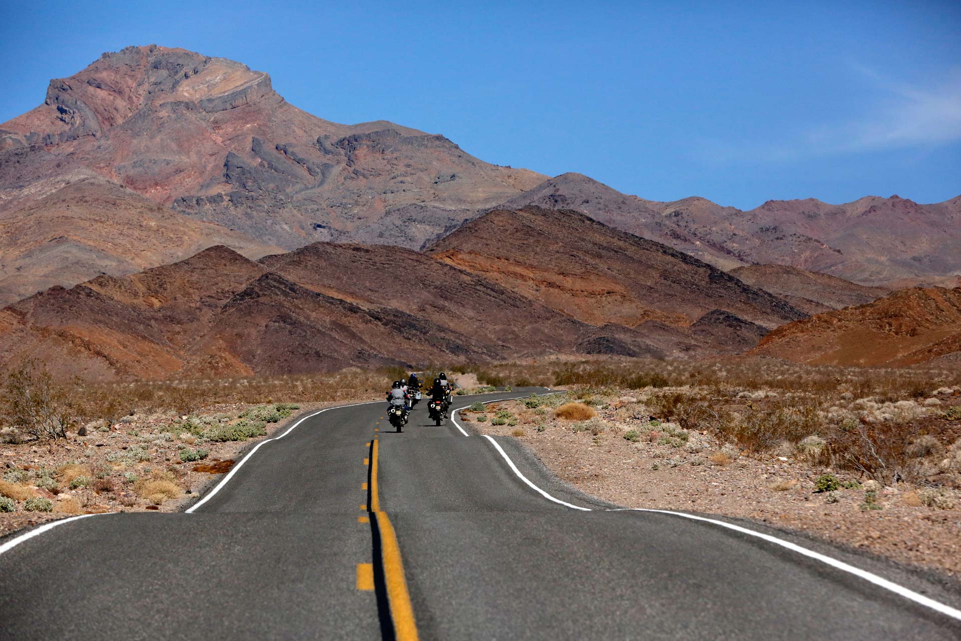 Death Valley as few have ever seen it–we’ll enter via “the back way” 90 miles of incredibly beautiful back country riding await you on the only easy dirt road entrance to Death Valley. You’ll have a chance to visit the “racetrack” where boulders move mysteriously across the playa of a dry lake bed. On your exit from the racetrack you’ll have a chance to see Ubehebe Crater –the largest “steam crater” in the continental US. Created when groundwater managed to seep deep down into the earth and hit the super hot rock deep in the earth’s crust. The water turned to steam and the resulting explosion left a crater nearly a third of a mile deep.